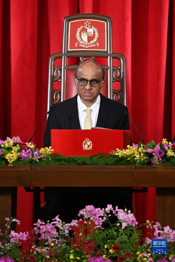 9月14日,当选总统尚达曼在新加坡总统府出席宣誓就职仪式。