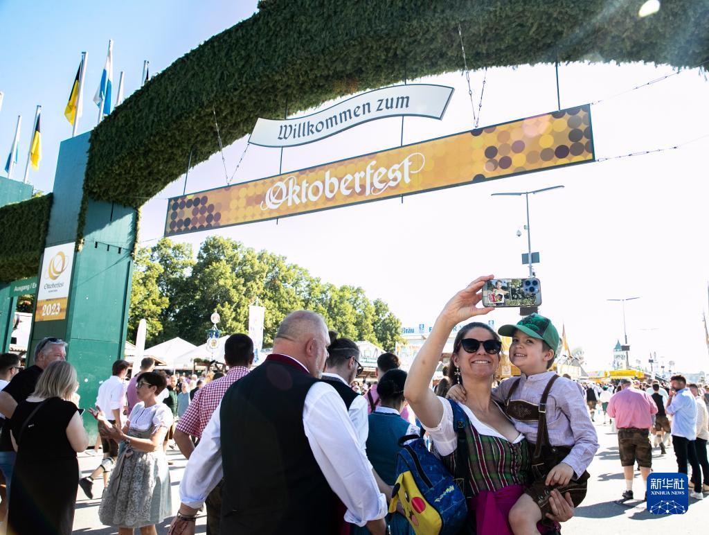 9月16日,人们在德国慕尼黑啤酒节上自拍。