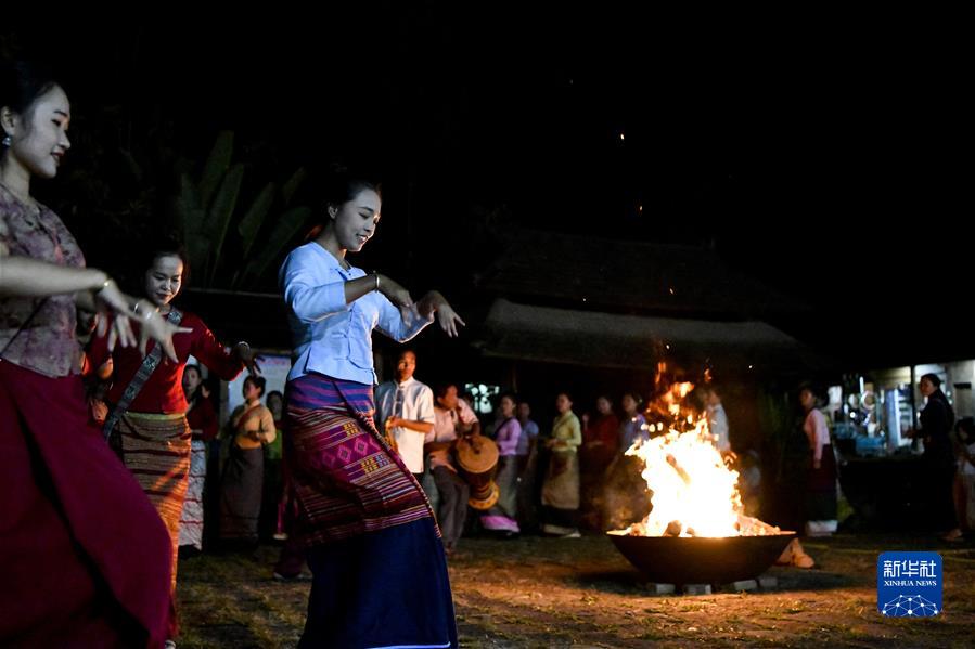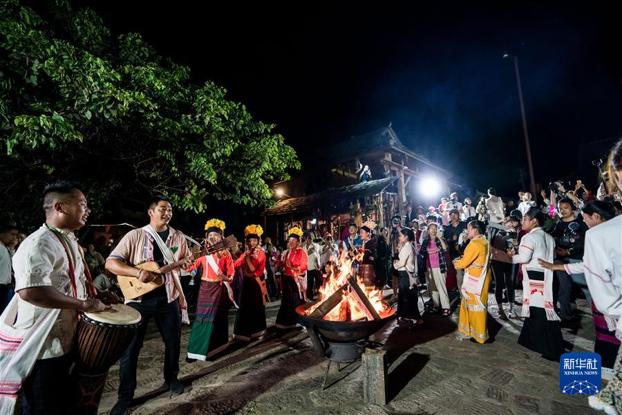 9月17日,在景迈山翁基古寨,人们围着篝火跳舞庆祝。 新华社记者 胡超 摄