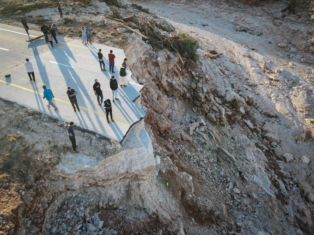 这是9月15日在利比亚东部德尔纳附近拍摄的被毁的桥梁(航拍照片)。新华社发(易卜拉欣·哈迪娅·马吉卜里摄)