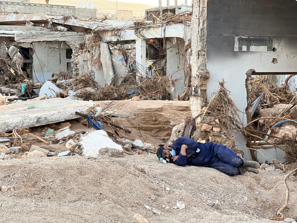 9月17日,一名救援人员躺在利比亚德尔纳的建筑物废墟上休息。