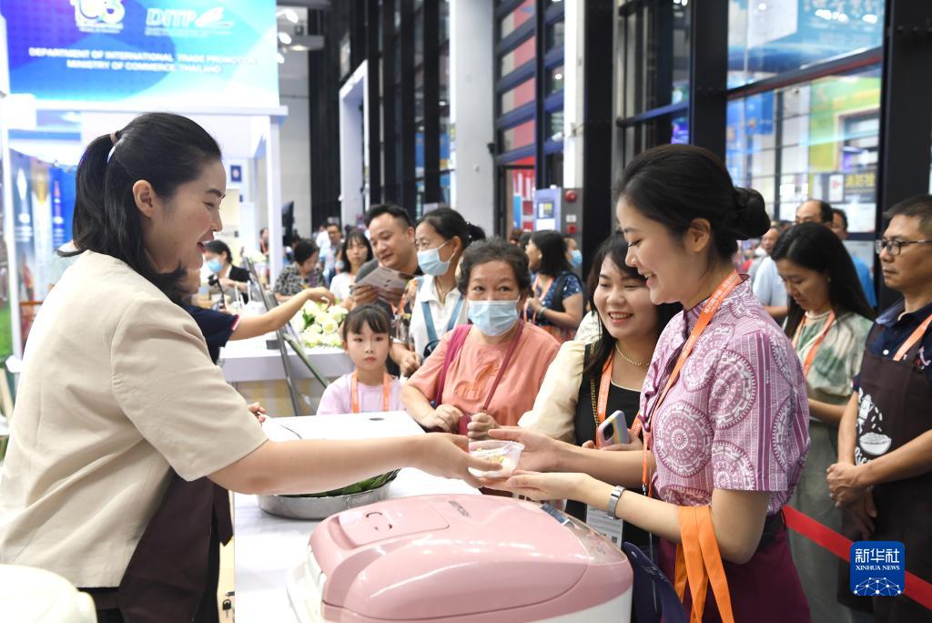 9月18日,在南宁国际会展中心,观众在泰国商品馆排队品尝泰国香米。