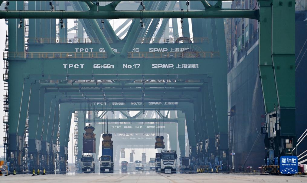 9月18日,卡车在天津港太平洋国际集装箱码头运输集装箱。