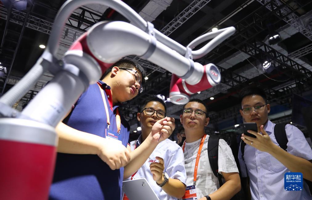 9月19日,工作人员(左)与参观者在一个进行作业演示的机器人展品旁交流讨论。