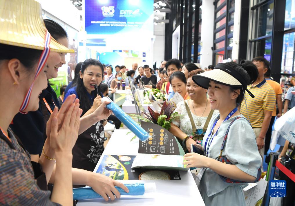 9月19日,在东博会泰国商品馆,观众在排队参加关于泰国商品的有奖问答。