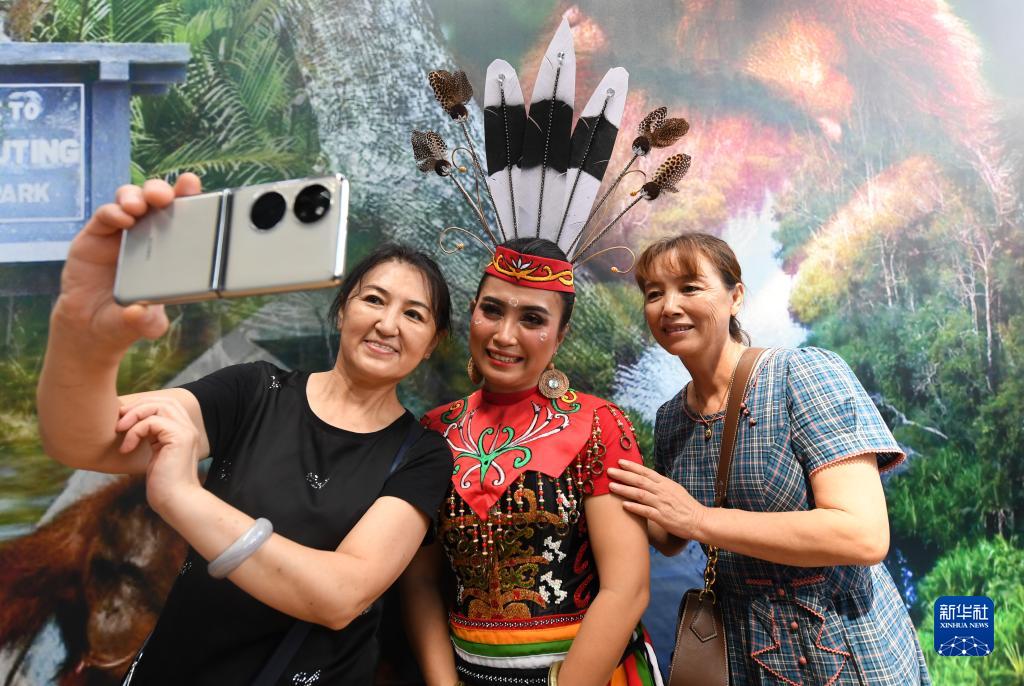 9月19日,观众在东博会上和来自印度尼西亚的演员(中)合影。