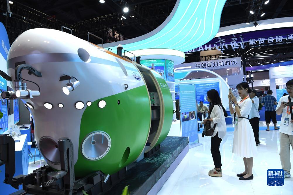 9月19日,观众在东博会上了解“奋斗者”号全海深载人潜水器模型。