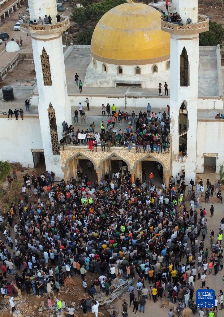 9月18日,市民在利比亚德尔纳清真寺前集会,呼吁大家团结起来。新华社发(胡沙姆·图尔基亚摄)