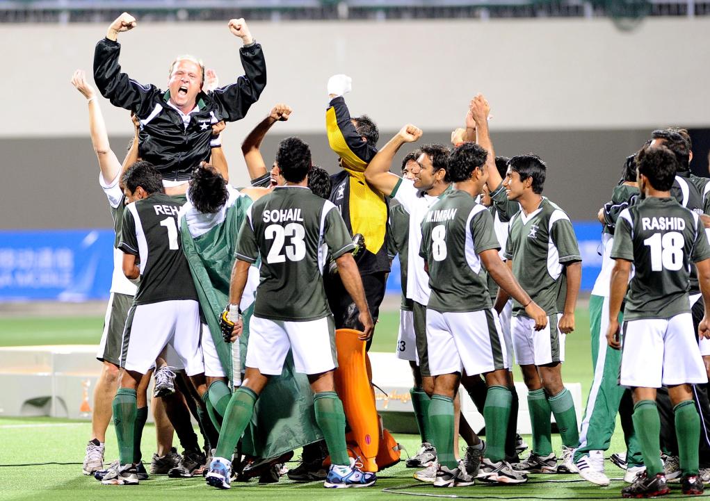 2010年11月25日,巴基斯坦队球员在比赛获胜后欢呼庆祝。当日,在第16届亚运会曲棍球男子决赛中,巴基斯坦队以2比0战胜马来西亚队,获得冠军。新华社记者陈凯摄