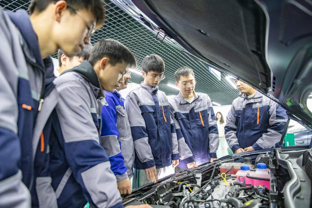 2月22日,在重庆城市职业学院“陈志军汽车维修工国家级技能大师工作室”,学生们在老师的带领下学习新能源汽车维修。(新华社记者黄伟摄)