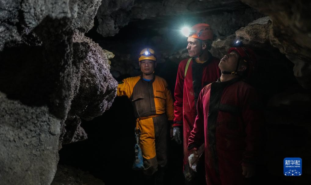 意大利专家和贵州省山地资源研究所科考队员在双河洞一处支洞中进行探索(9月24日摄)。