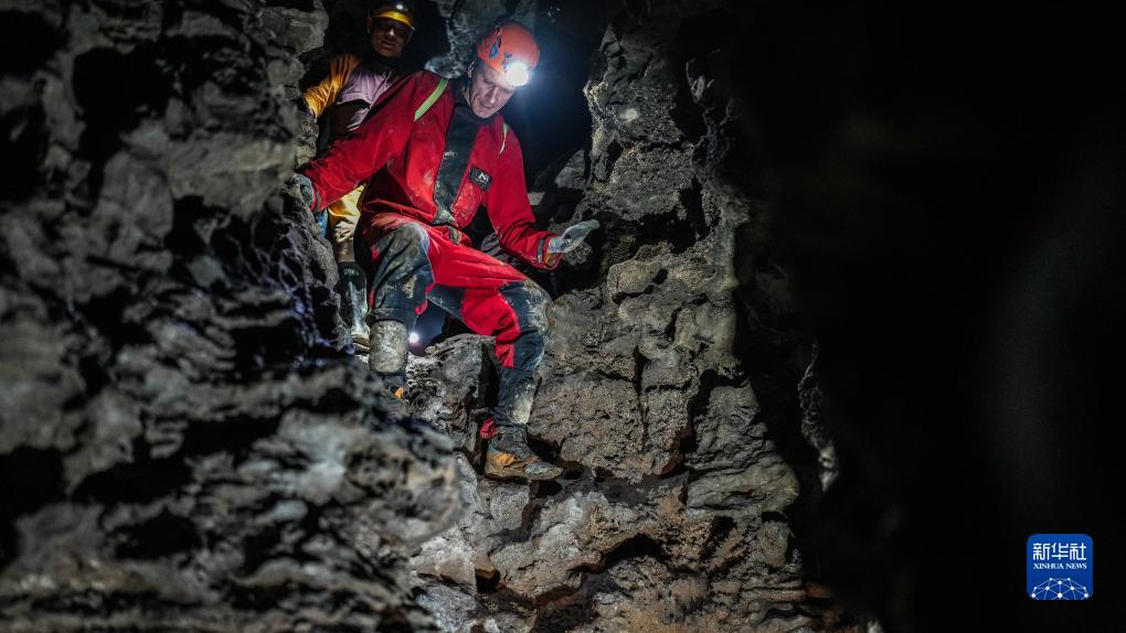 意大利专家和贵州省山地资源研究所科考队员在双河洞一处支洞中行进(9月24日摄)。