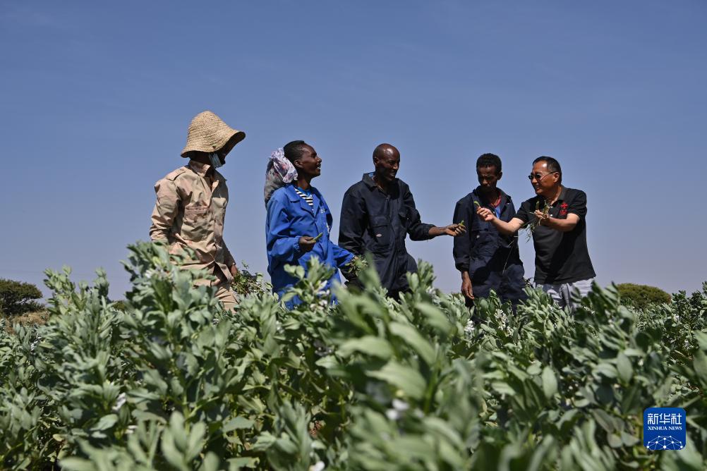 9月27日,在位于厄立特里亚阿斯马拉的农业技术援助项目示范地,中国援厄第三期高级农业专家组豆类作物专家刘运民(右一)与当地农户交流。