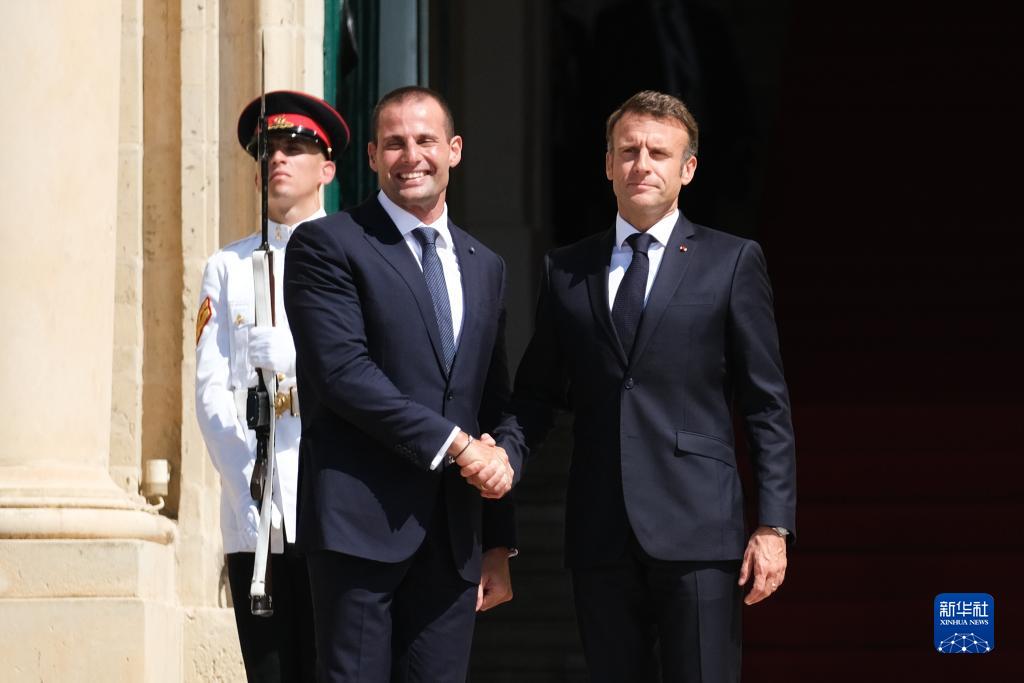 9月29日,在马耳他瓦莱塔,马耳他总理阿贝拉(前左)欢迎前来参会的法国总统马克龙(前右)。