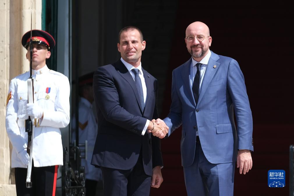 9月29日,在马耳他瓦莱塔,马耳他总理阿贝拉(前左)欢迎前来参会的欧洲理事会主席米歇尔(前右)。