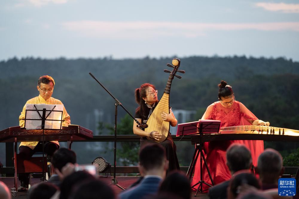 9月29日,演员在巴西伊瓜苏举行的中秋晚会上演奏中国民乐。