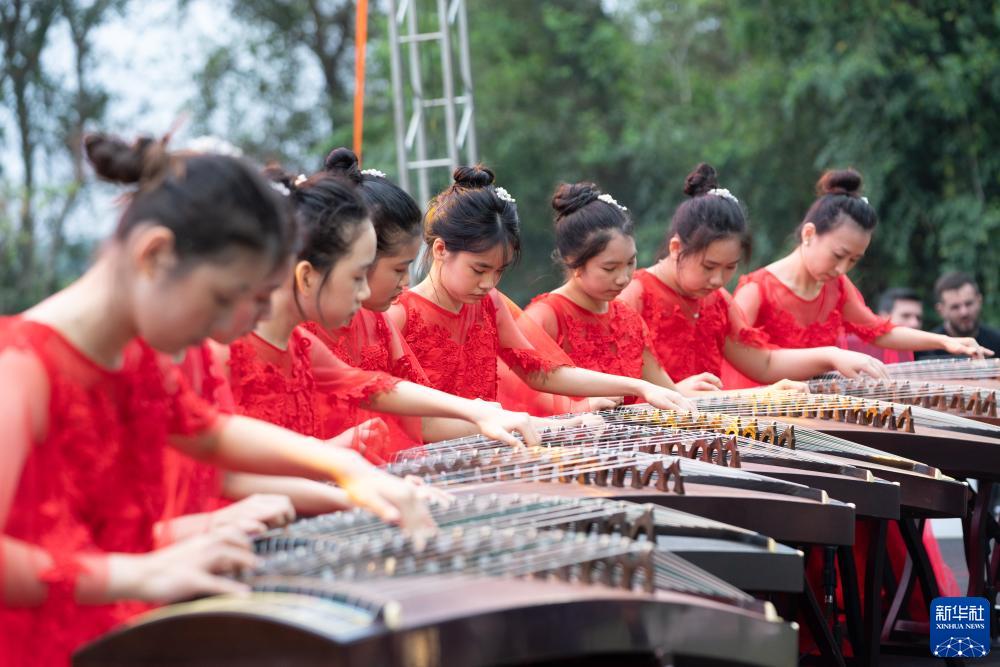 9月29日,演员在巴西伊瓜苏举行的中秋晚会上演奏古筝。