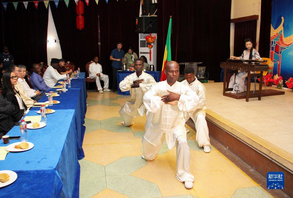 9月23日,在贝宁科托努,当地武术爱好者在贝宁中国文化中心举办的中秋音乐会上表演太极。