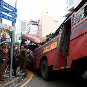 这是10月6日在斯里兰卡科伦坡拍摄的公交车被砸事故现场。