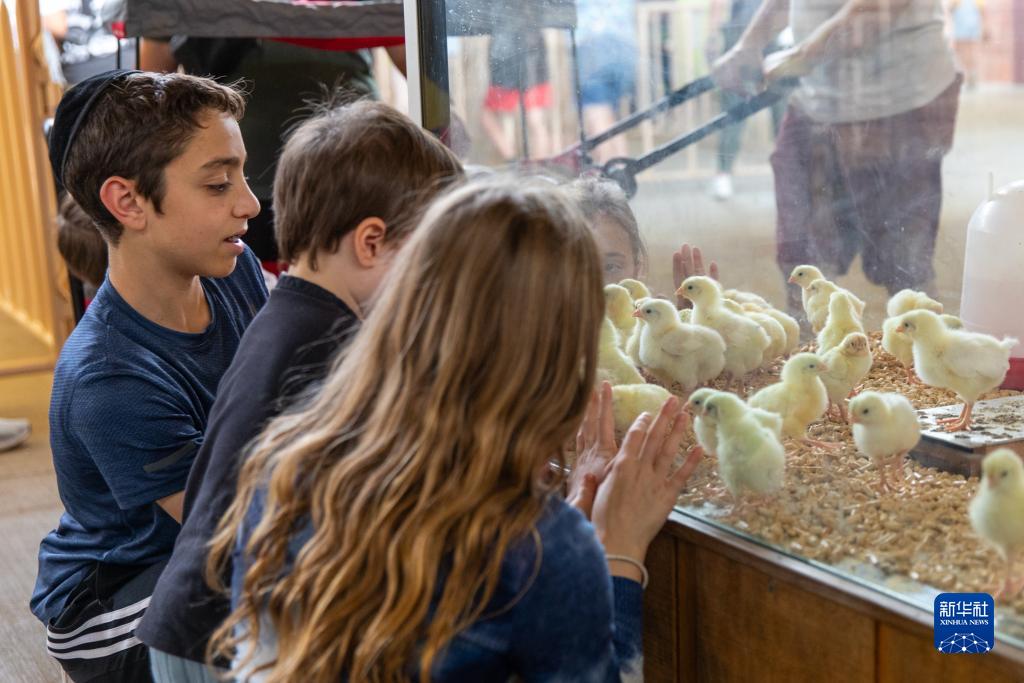 10月5日,在美国达拉斯的得克萨斯州博览会上,几名儿童观看一群刚孵化出来的小鸡。