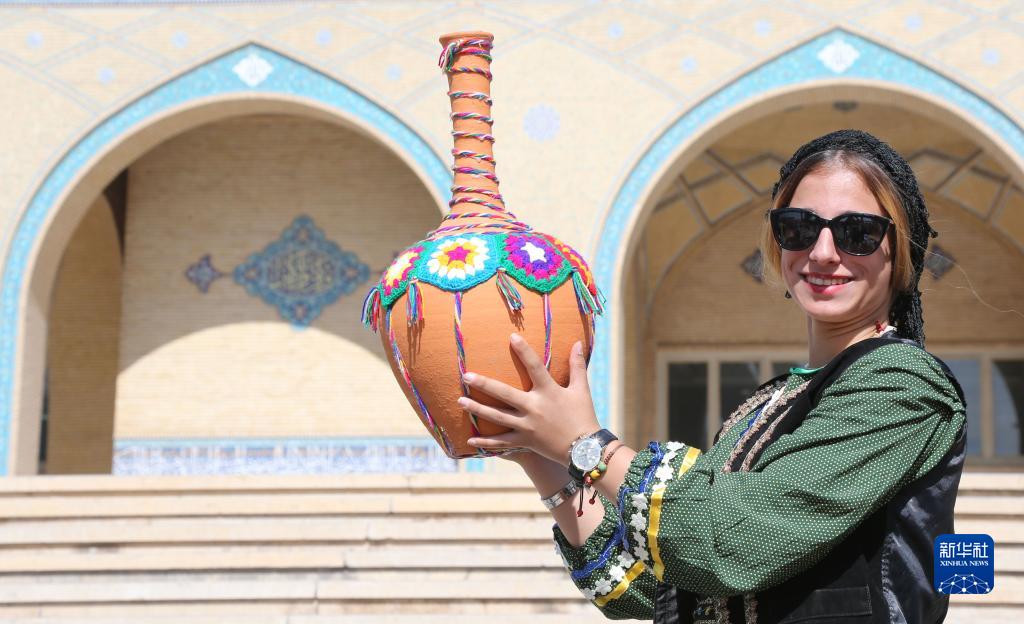 10月5日,在伊朗首都德黑兰,一名身着传统服饰的女子展示手工艺品。