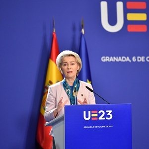10月6日,在西班牙南部城市格拉纳达,欧盟委员会主席冯德莱恩在欧盟领导人非正式会议后举行的新闻发布会上讲话。新华社记者连漪摄