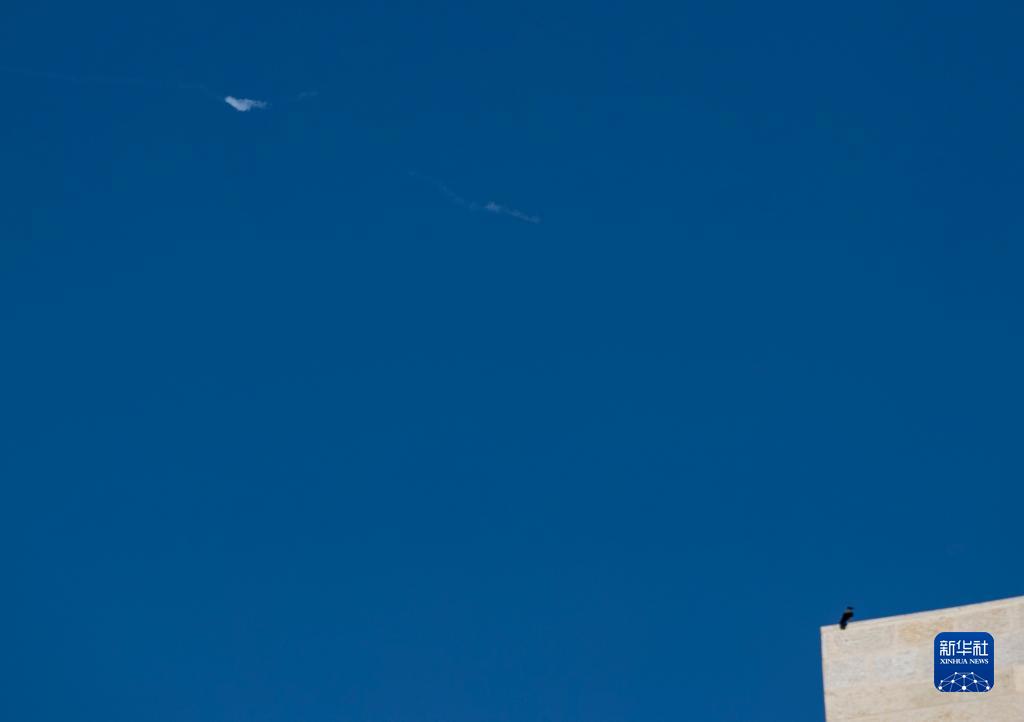 这是10月7日在耶路撒冷拍摄的以色列“铁穹”防御系统拦截火箭弹后的烟雾。