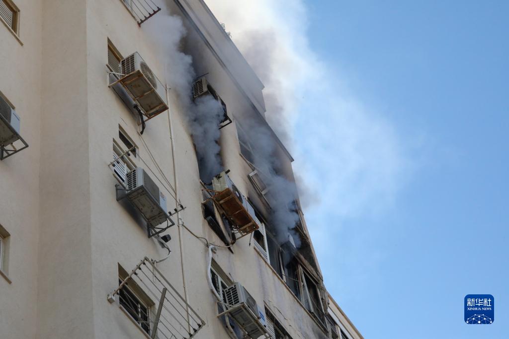 这是10月7日在以色列特拉维夫拍摄的一栋遭火箭弹袭击的建筑。
