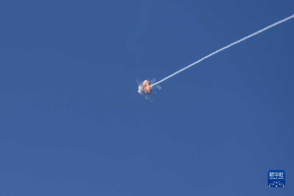 10月7日,在以色列南部城市阿什克隆,以色列“铁穹”防御系统导弹成功拦截从加沙地带发射的火箭弹。