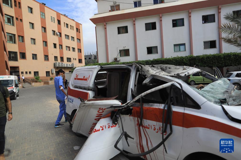 这是10月7日在加沙地带城市汗尤尼斯拍摄的在以色列空袭中受损的救护车。