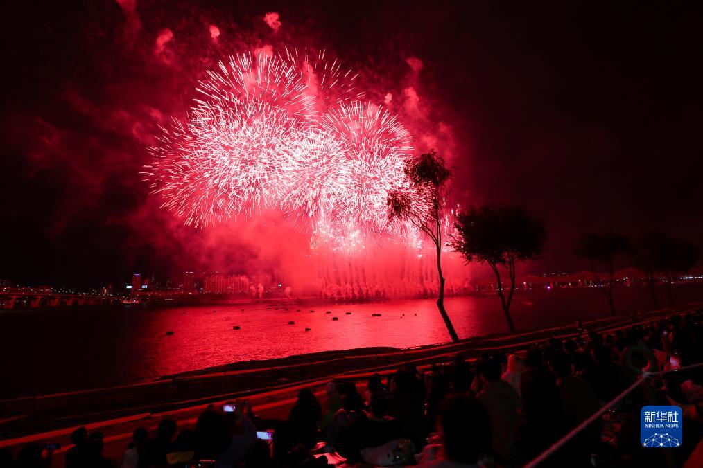 10月7日,人们在韩国首尔国际烟花节上欣赏烟花表演。