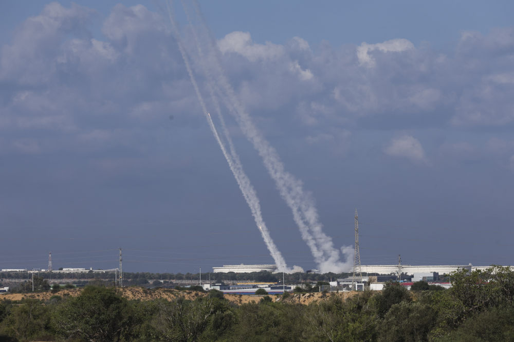 ↑10月7日,在以色列南部城市阿什克隆,以色列“铁穹”防御系统发射导弹,拦截从加沙地带发射的火箭弹。新华社发(伊兰·阿萨亚格摄/基尼图片社)