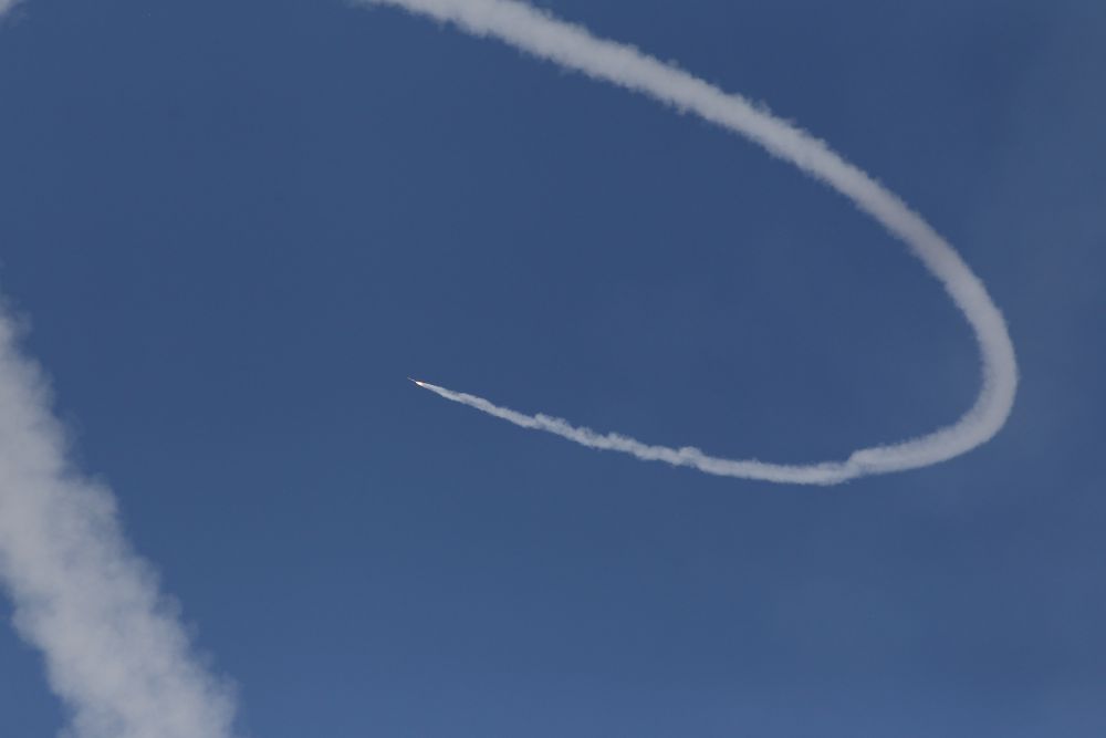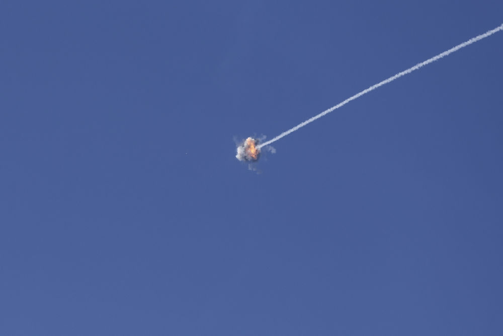 ↑10月7日,在以色列南部城市阿什克隆,以色列“铁穹”防御系统导弹成功拦截从加沙地带发射的火箭弹。新华社发(伊兰·阿萨亚格摄/基尼图片社)