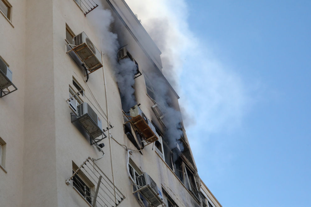 ↑这是10月7日在以色列特拉维夫拍摄的一栋遭火箭弹袭击的建筑。新华社发(吉德翁·马科维奇摄/基尼图片社)