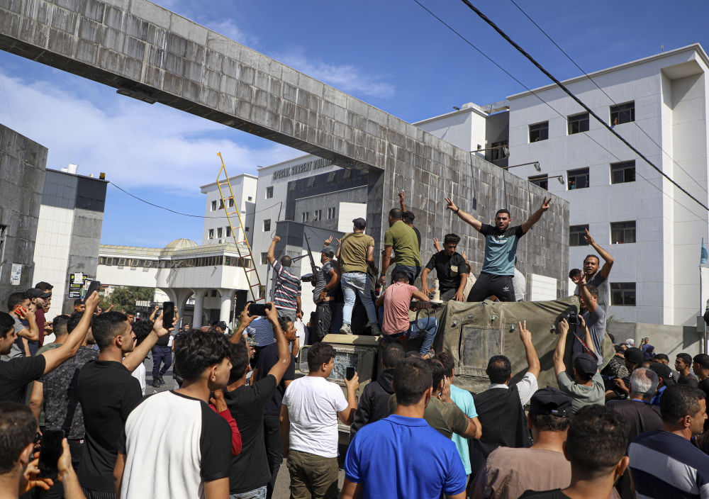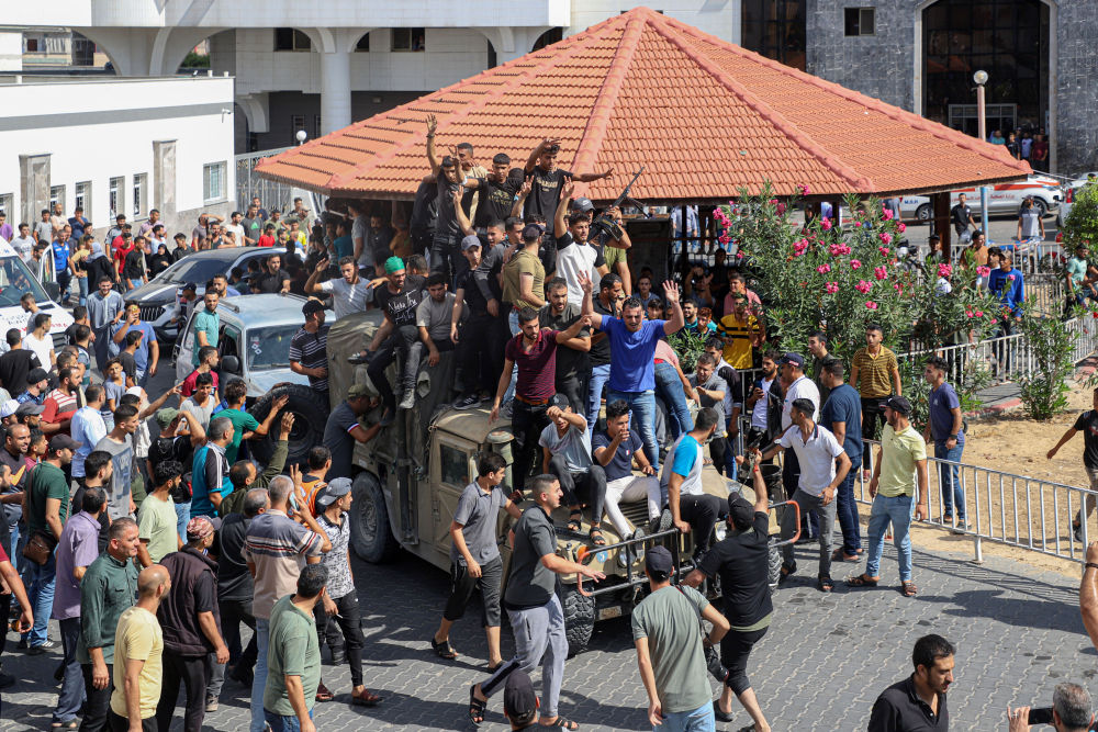 ↑10月7日,在加沙城,巴勒斯坦人登上一辆以色列军用车辆。新华社发(里泽克·阿卜杜勒贾瓦德摄)