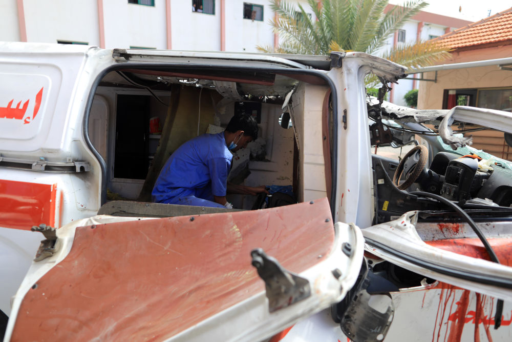 ↑这是10月7日在加沙地带城市汗尤尼斯拍摄的在以色列空袭中受损的救护车。新华社发(哈立德·奥马尔摄)