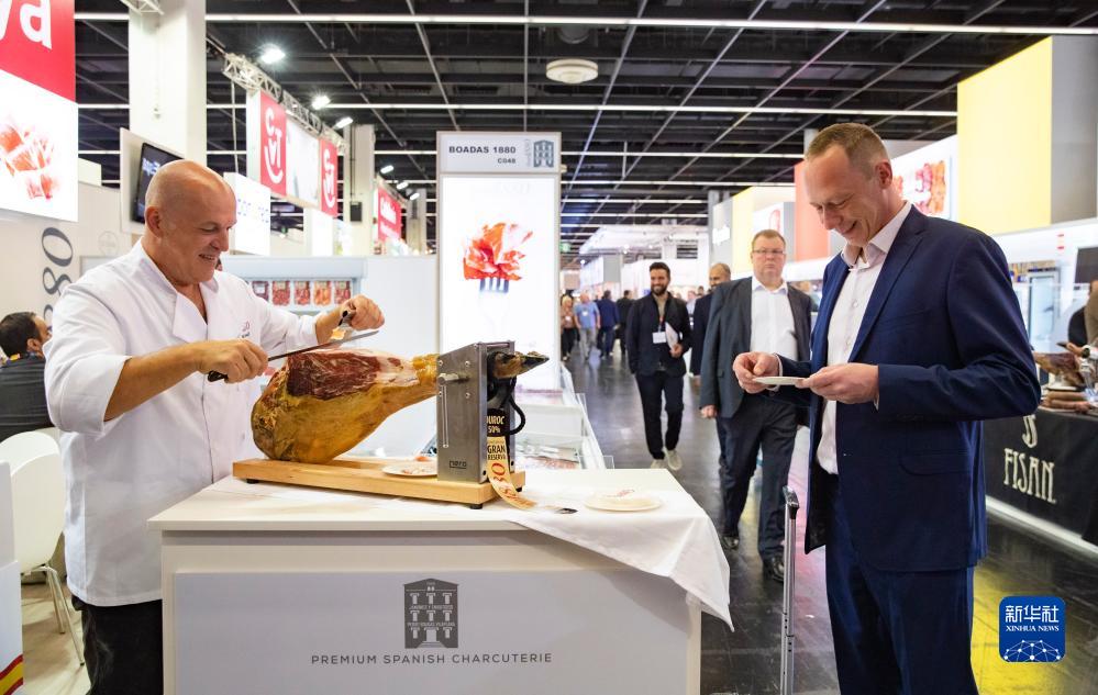 10月7日,参观者在德国科隆国际食品博览会上品尝火腿。新华社记者 张帆 摄