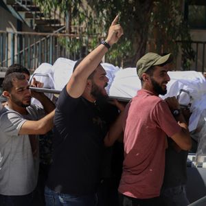 10月7日,人们在加沙城的一家医院抬着遇难亲人的尸体。