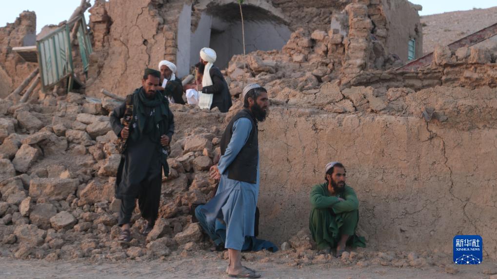 10月7日,人们在阿富汗赫拉特省坍塌的房屋旁等待。