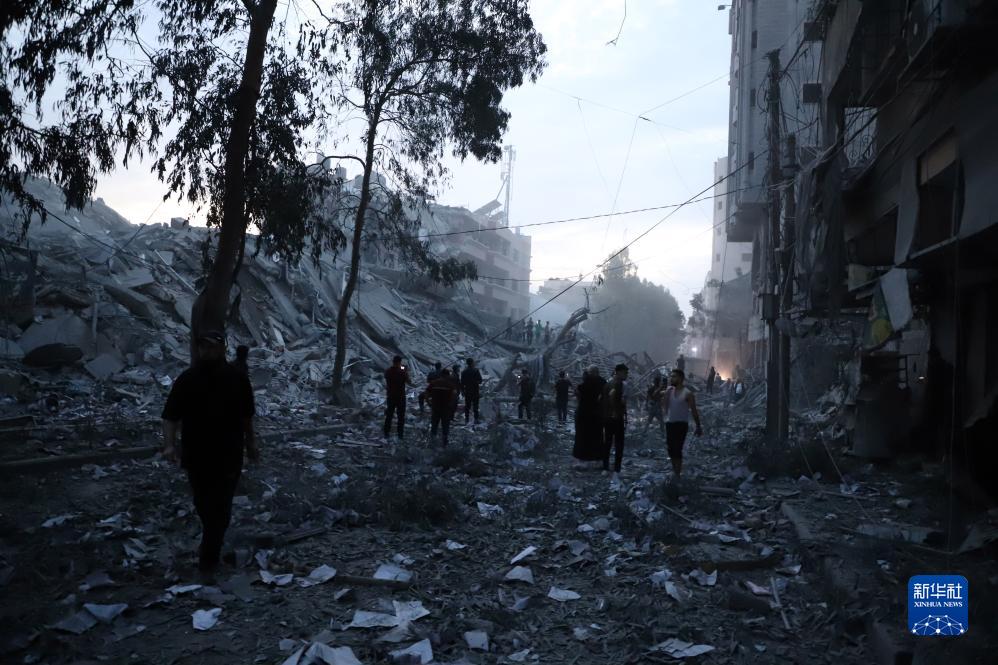 10月7日,巴勒斯坦民众在加沙城查看以色列空袭后毁坏的民宅。