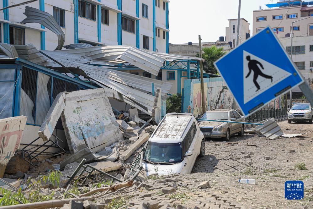 这是10月8日在加沙城拍摄的被以色列空袭炸毁的一所学校的入口。新华社发(里泽克·阿卜杜勒贾瓦德摄)