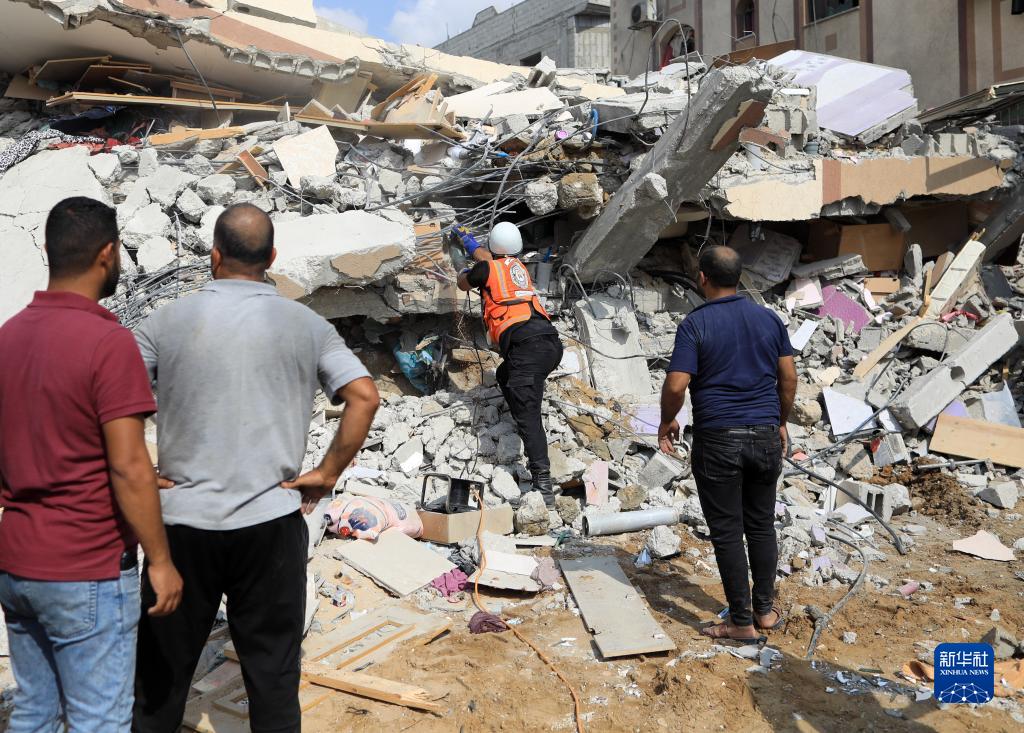 10月8日,在加沙地带南部城市汗尤尼斯,人们在以色列空袭后的建筑废墟中搜寻幸存者。