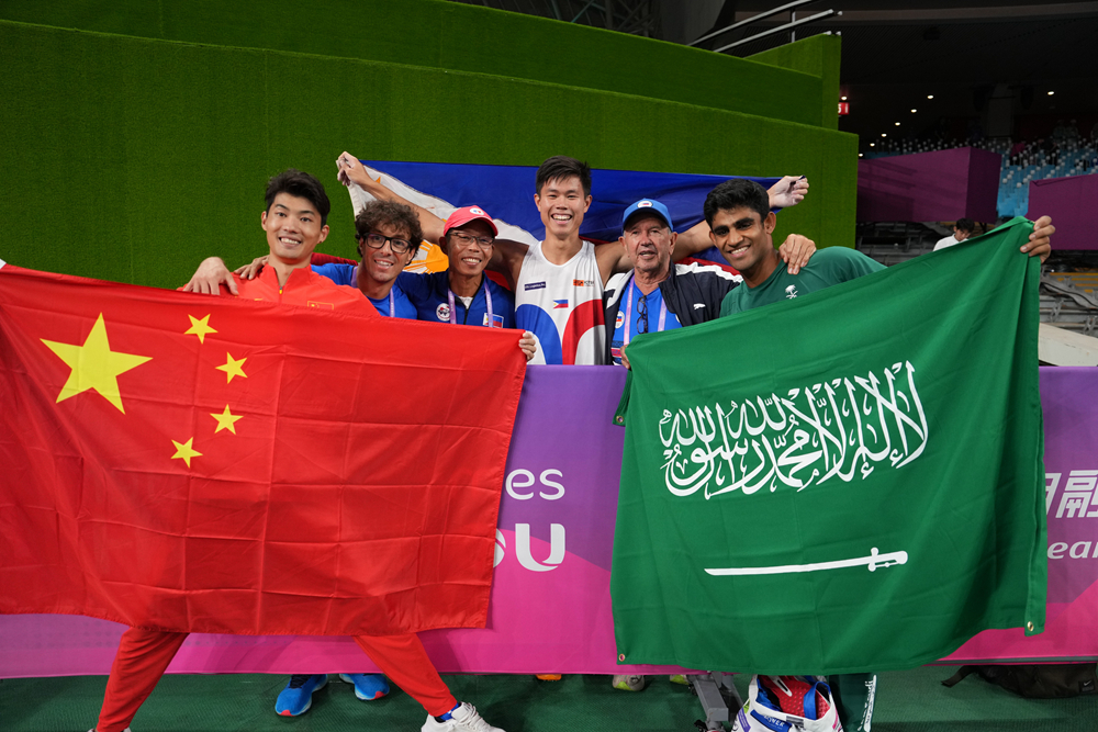 9月30日,菲律宾选手奥贝纳(右三)、中国选手黄博凯(左一)和季军沙特阿拉伯选手希扎姆(右一)在杭州亚运会田径项目男子撑杆跳高决赛后合影。新华社记者 李一博 摄