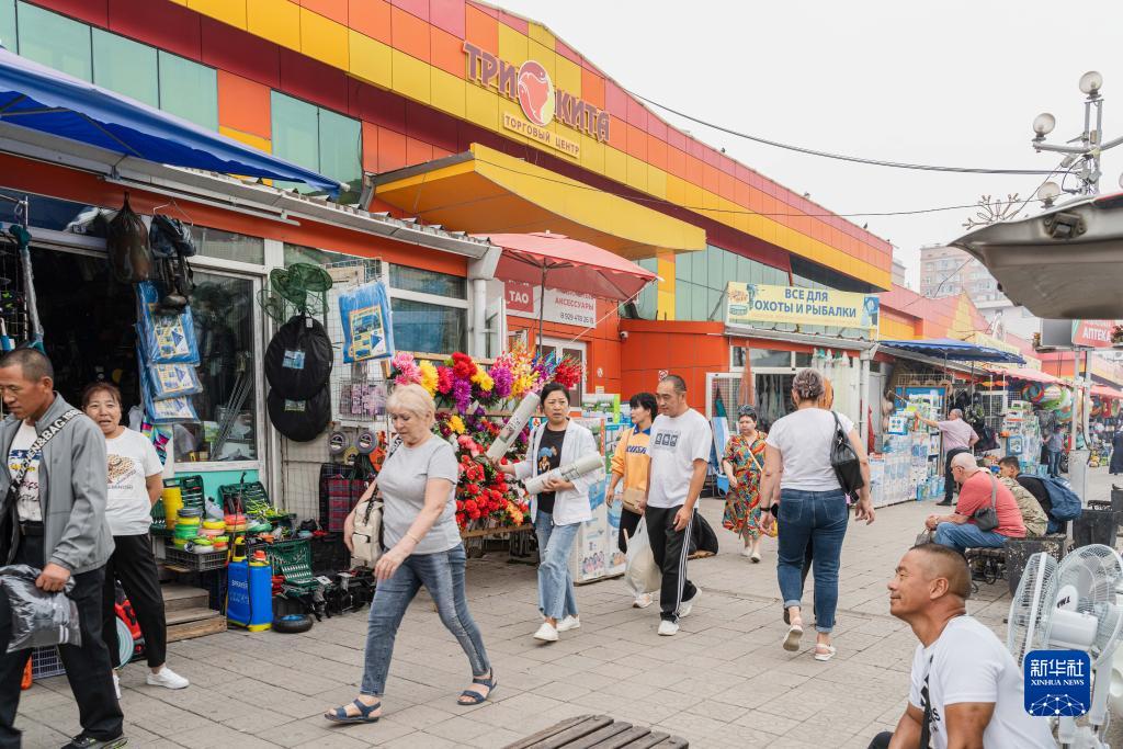 7月25日,人们在俄罗斯布拉戈维申斯克的“三只鲸鱼”中国市场购物。