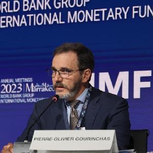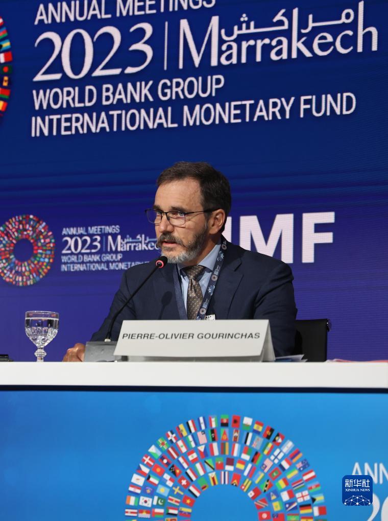 10月10日,在摩洛哥马拉喀什,国际货币基金组织首席经济学家皮埃尔-奥利维耶·古兰沙在《世界经济展望报告》发布会上讲话。