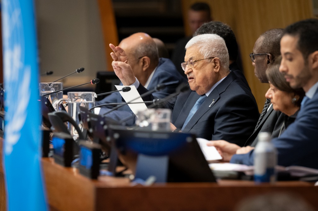 5月15日,巴勒斯坦总统阿巴斯(中)在联合国巴勒斯坦人民行使不可剥夺权利委员会高级别会议上致辞。新华社发(联合国供图/马克·加滕摄)