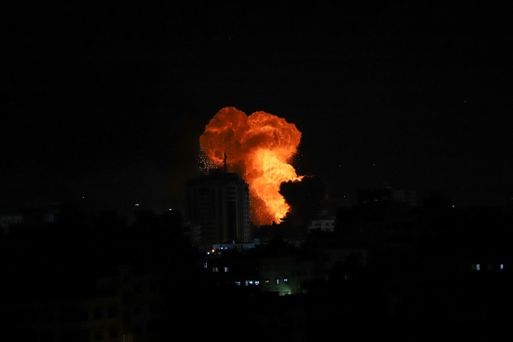 这是10月9日晚在加沙城拍摄的以色列军队空袭产生的火光。新华社发(里泽克·阿卜杜勒贾瓦德摄)