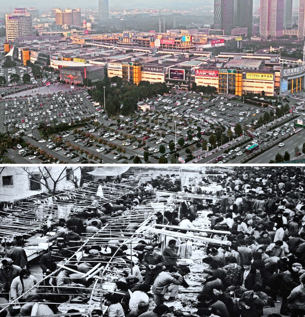 上图为:2018年10月24日拍摄的义乌国际商贸城一区市场;下图为:1982年9月开业的义乌第一代小商品市场的资料照片。
