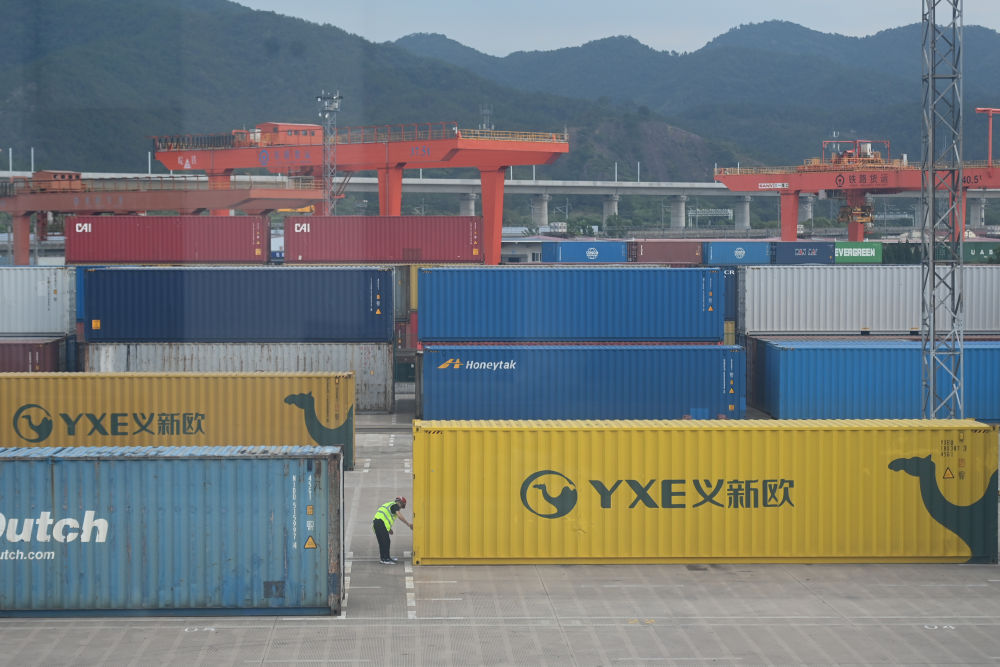 ↑工作人员在铁路义乌西站检查“义新欧”集装箱