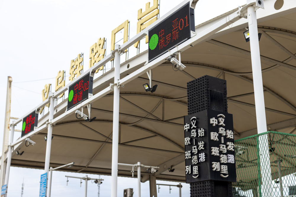 ↑义乌铁路西站拍摄的中欧班列(义乌-马德里)始发港标识